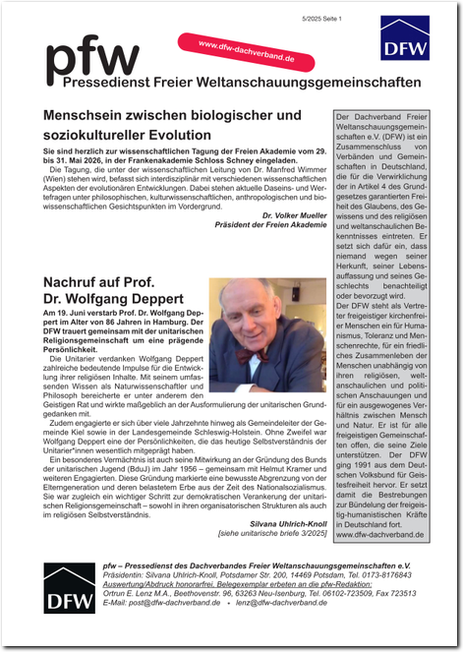 Am 19. Juni verstarb Prof. Dr. Wolfgang Deppert im Alter von 86 Jahren in Hamburg. Der DFW trauert gemeinsam mit der unitarischen Religionsgemeinschaft um eine prägende Persönlichkeit.