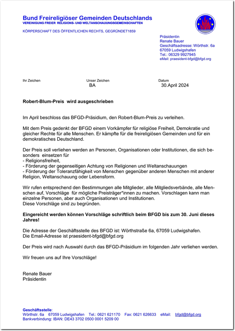 Erklärung des Bundes Freireligiöser Gemeinden Deutschlands (BFGD) zum Bericht über „Lebenswendefeiern“ vom 21. Mai 2024