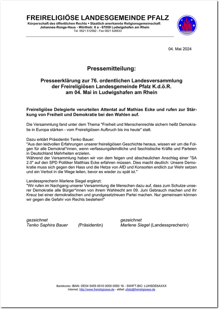 Freireligiöse, Freidenker, Unitarier und Humanisten stehen traditionell für Demokratie und gegen Dogmatismus, gegen Hass und Feindseligkeit, für Toleranz und Mitmenschlichkeit. Es ist klar, dass wir nicht tatenlos zusehen können und wollen, wie unsere hart erkämpften demokratischen Werte bedroht werden.
