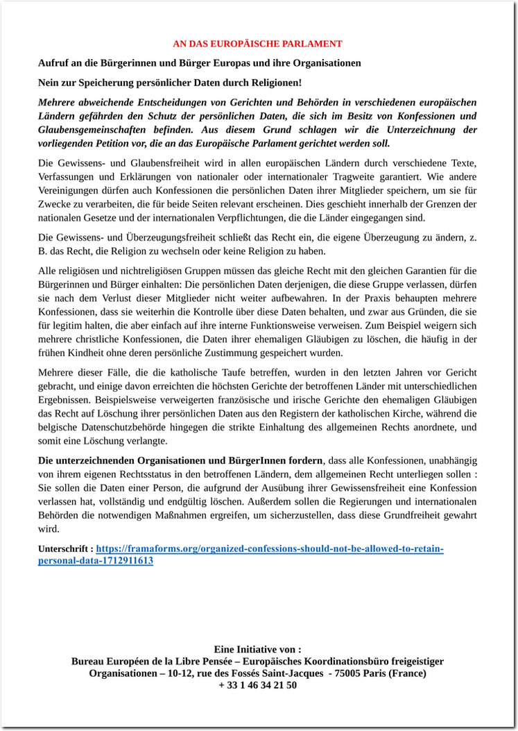 Der französische Freidenkerverband möchte eine europäische Kampagne zum Schutz der Privatdaten von Kirchenausgetretenen starten: Je nach Mitgliedstaat werden die relevanten EU-Regelungen anders interpretiert, und das nicht selten zugunsten der Kirchen (allen voran der katholischen). Es geht hier eigentlich um weltanschauliche Selbstbestimmung und Geistesfreiheit überhaupt.