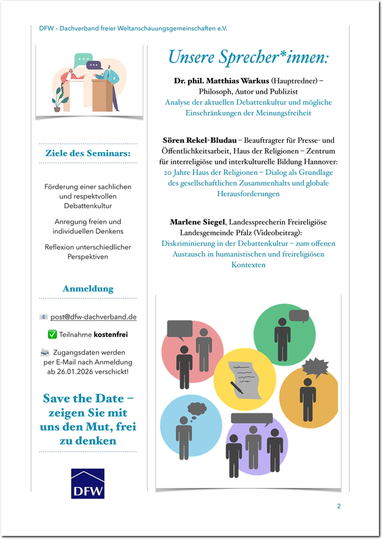 Der Dachverband Freier Weltanschauungsgemeinschaften e.V., vormals als Deutscher Volksbund für Geistesfreiheit im Oktober 1949 gegründet, vereint verschiedene freigeistige und humanistische Vereinigungen. Er vertritt die unterschiedlichen Interessen seiner ihm angehörenden freien Religions- und Weltanschauungsgemeinschaften in Deutschland und ist bei den Humanists International (HI) als Mitglied aktiv. Mit viel Auseinandersetzung, Ringen um die konsensfähige und vernünftige Lösung eines Problems und Streit in der Sache hat der Dachverband seine Aufgaben formuliert und realisiert, hat sie überprüft, kritisiert und verändert. Dabei bleiben auch manche Gesichtspunkte offen und ungeklärt. Nicht immer führen Streit und Auseinandersetzung im DFW zu Resultaten, doch ohne sie hätten wir kein demokratisches Miteinander und keine Dachverbands-Identität nach außen. Wir merken immer wieder, dass Aufrichtigkeit, Ehrlichkeit, Offenheit und Gleichberechtigung die wesentlichen Voraussetzungen für gemeinsames Arbeiten und Streiten sind. Sie wahren die Identität des DFW und den Respekt und die Toleranz voreinander, die zu freundschaftlicher Verbundenheit führen. ...weiterlesen...