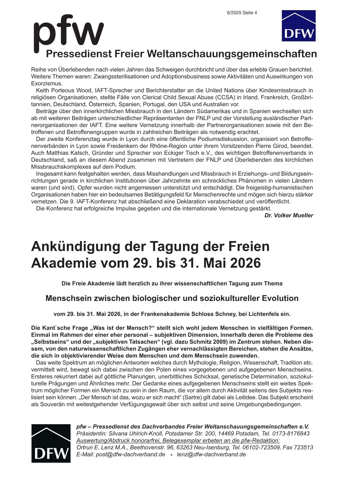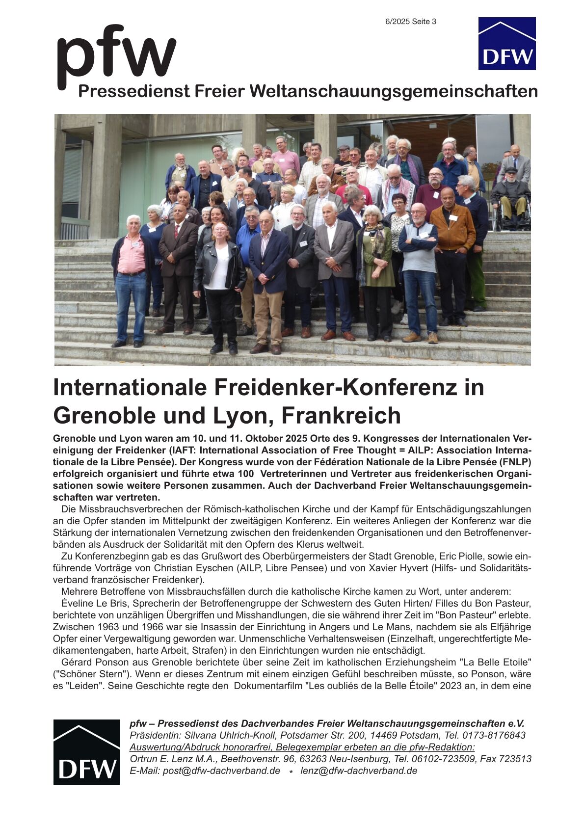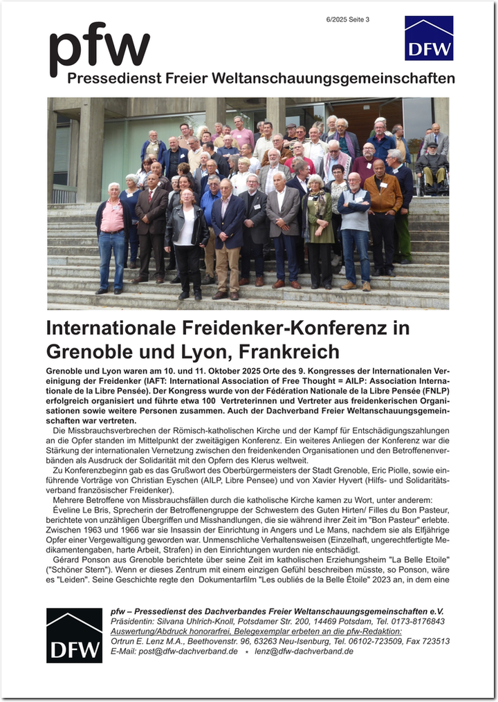 - Weltkongress des IAFT – Internationalen Verbandes für Geistesfreiheit – in GRENOBLE vom 10. bis 11. Oktober 2025